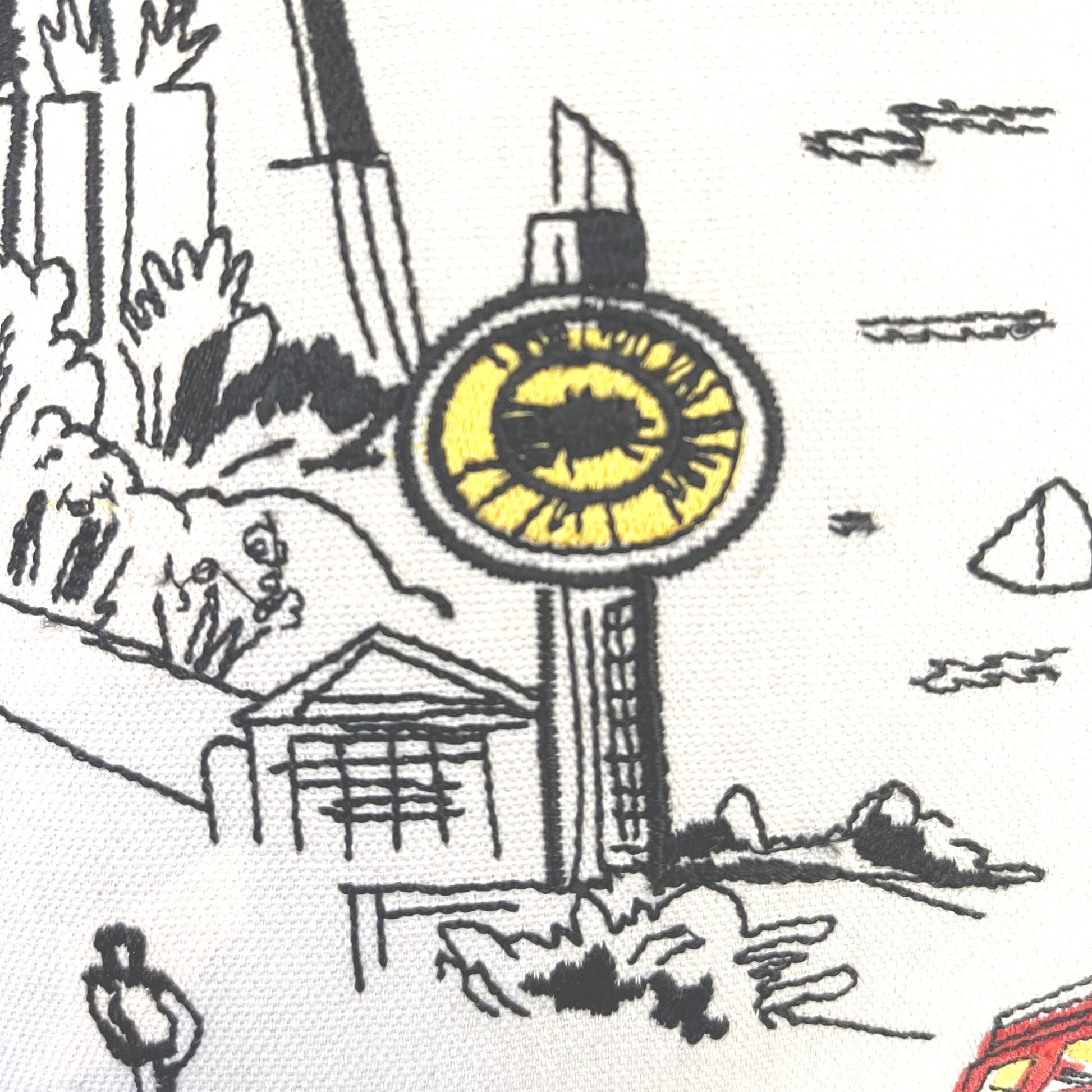 100% cotton canvas pillow set that is beautifully embroidered with each cities most iconic landmarks. Each set comes in either day (ivory background) or night (black background) versions. The pillows have red piping and a plain background. Has a zipper opening on the bottom side. Insert included.