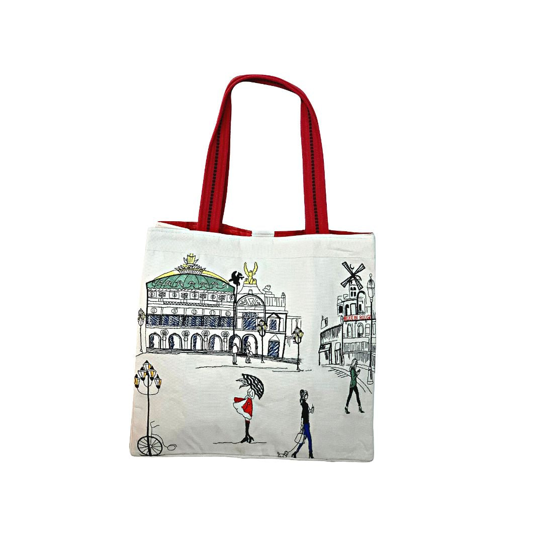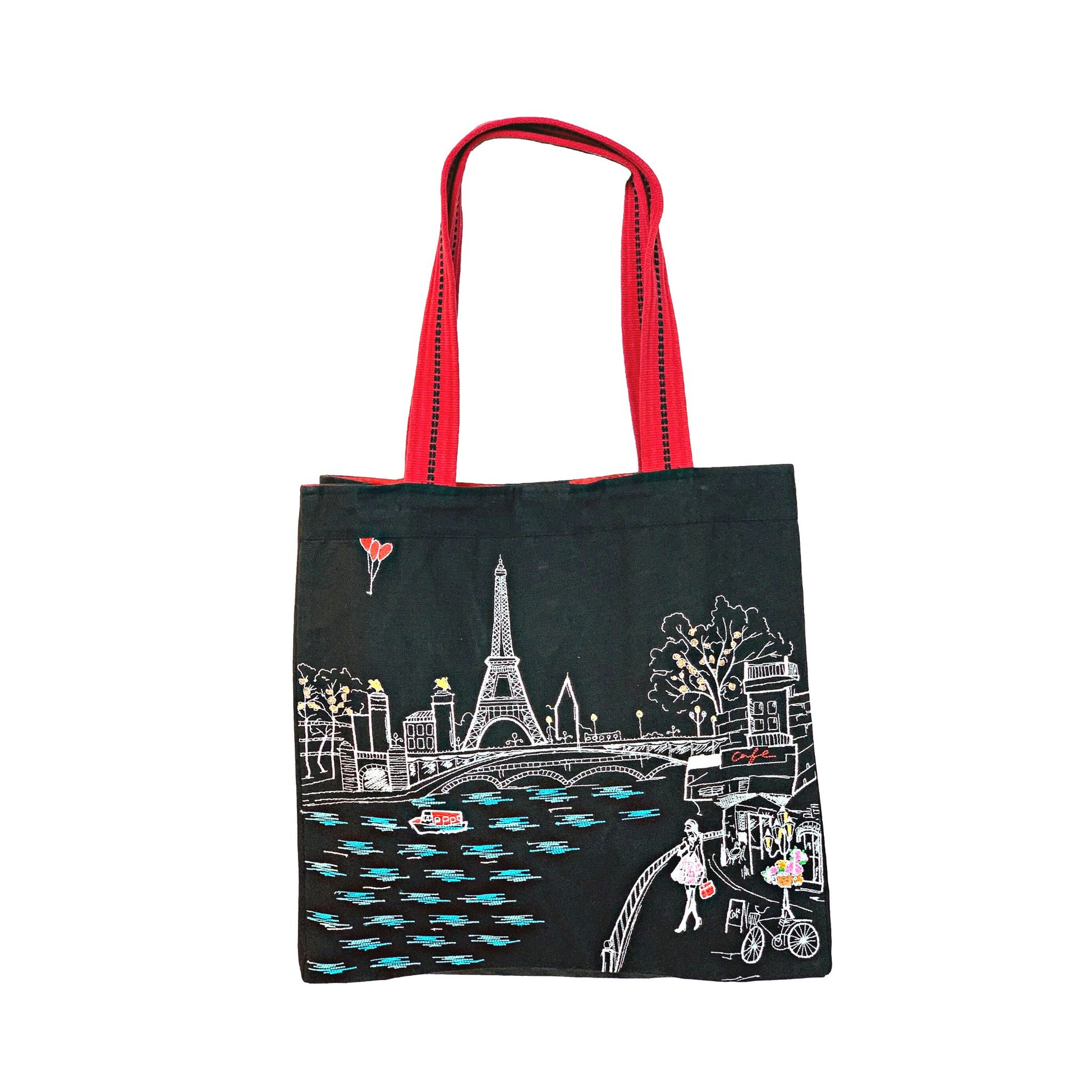 Our 100% cotton canvas totes are beautifully embroidered in our signature, modern whimsical design style with hints of brilliant color, bringing each of our skylines to life. Each Tote comes in two color options of Day (Cream) and Night (Black). Our totes come with red waterproof washable lining, an inside pocket and attractive ribbed red straps. The day and night options are showing each side of the same bag.