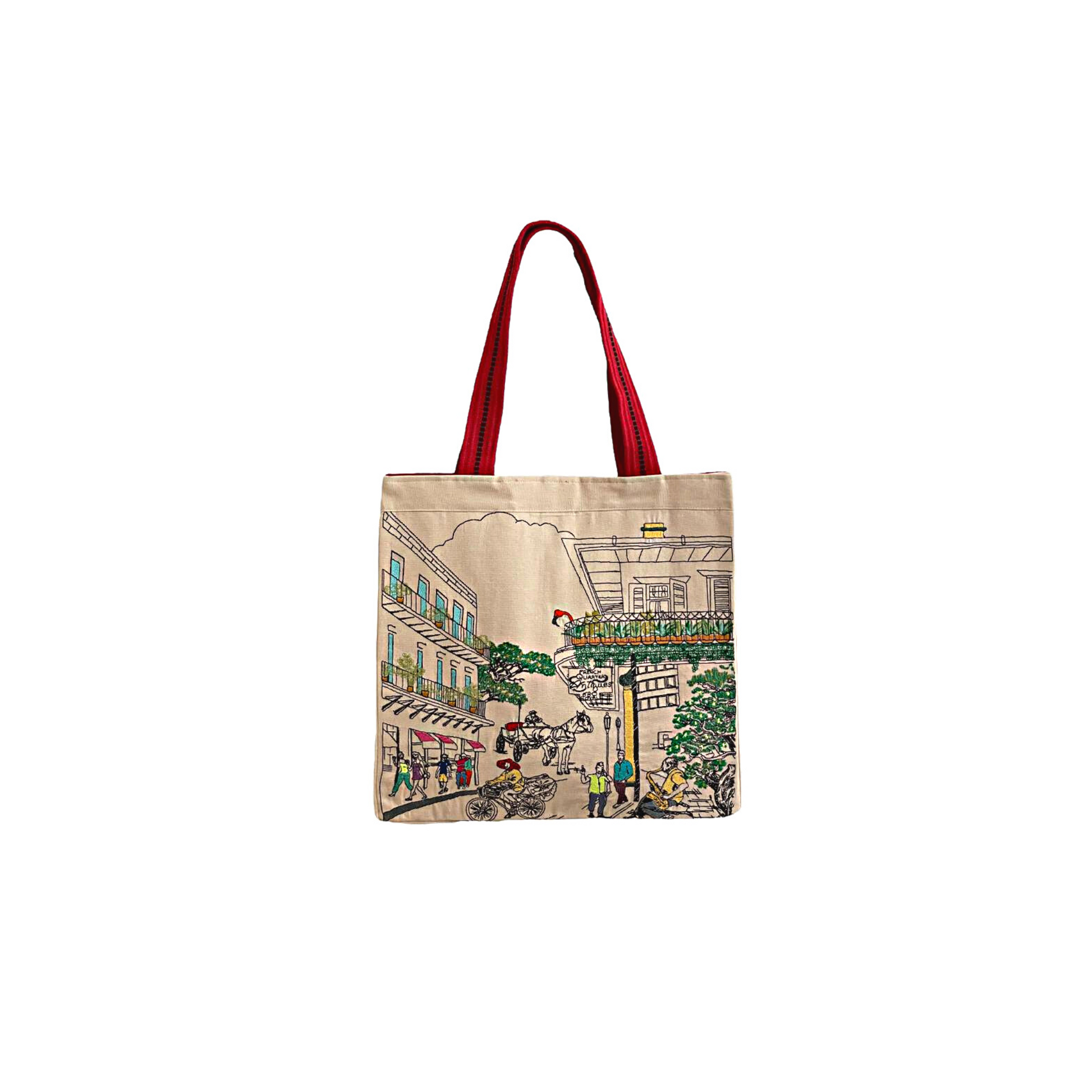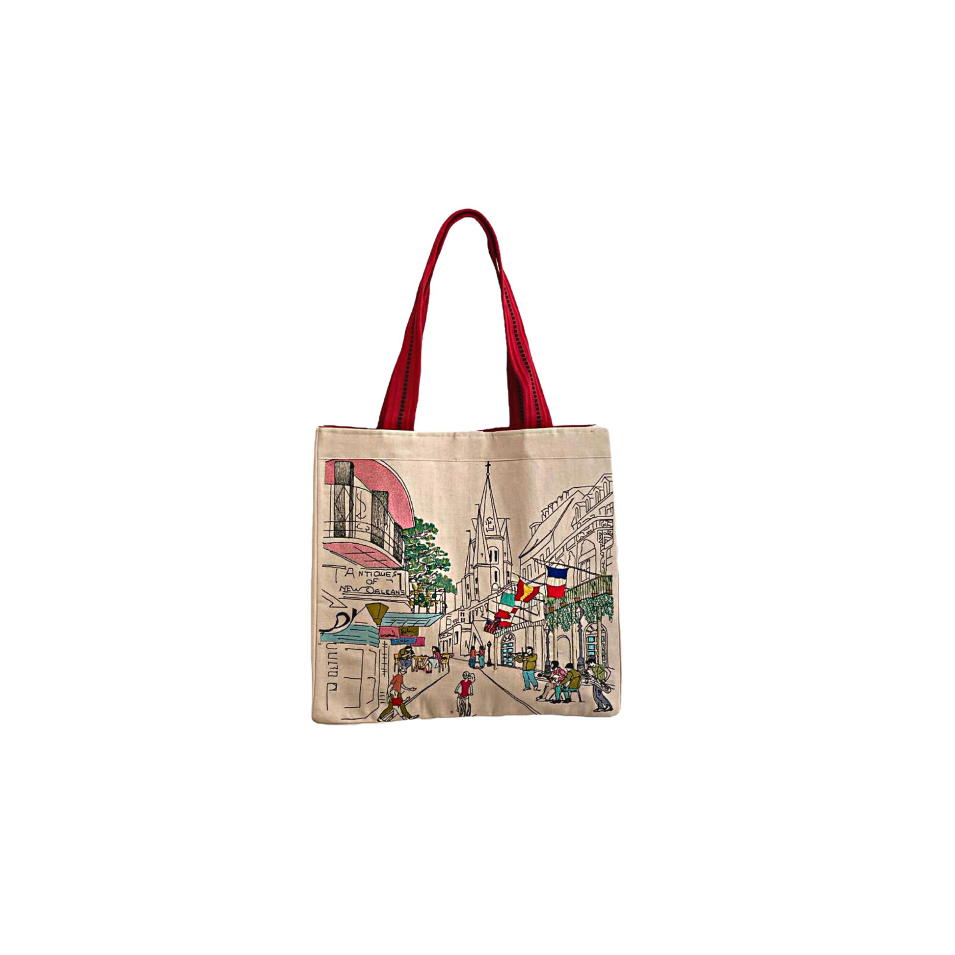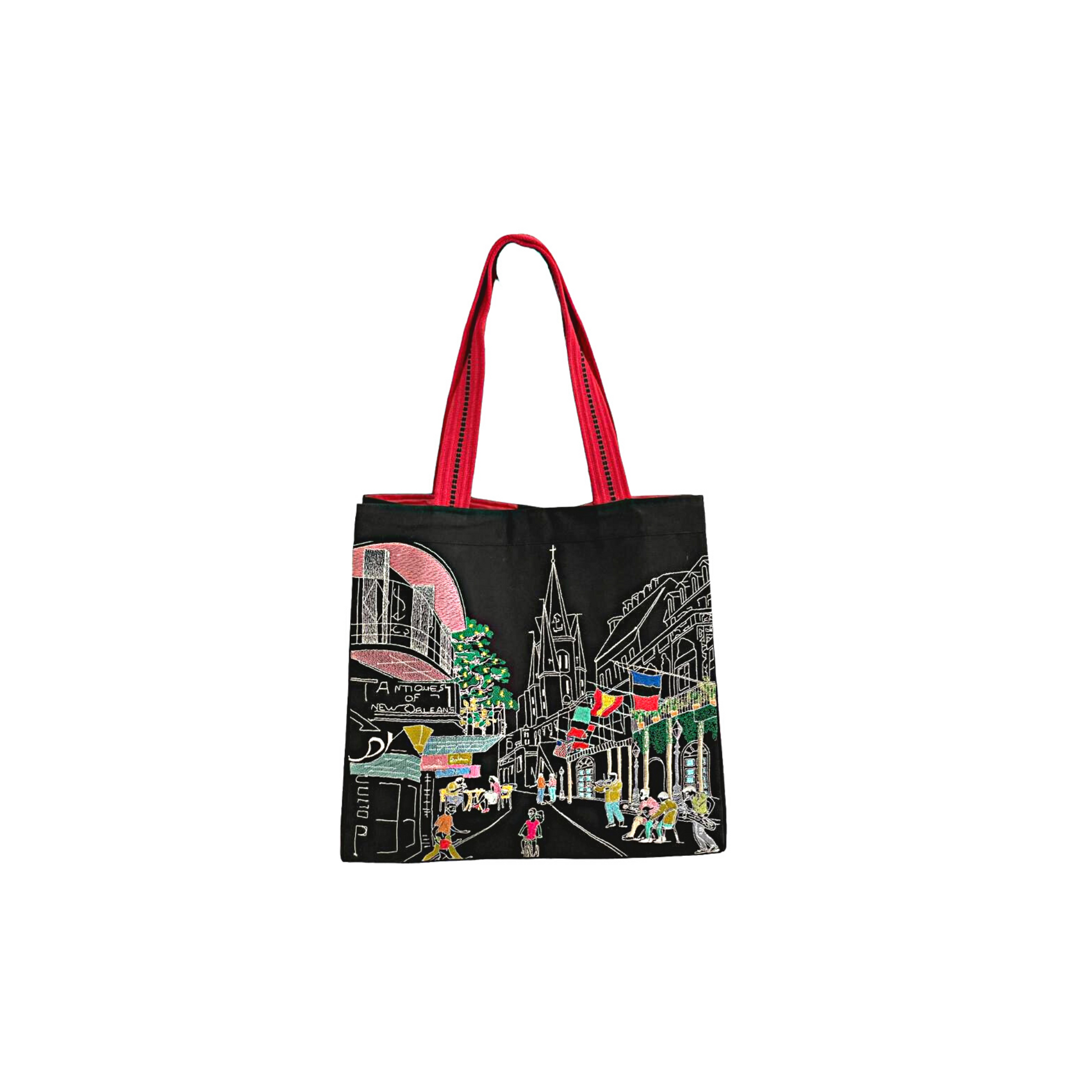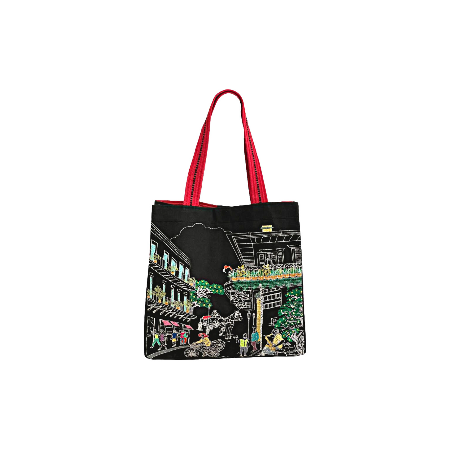 Our 100% cotton canvas totes are beautifully embroidered in our signature, modern whimsical design style with hints of brilliant color, bringing each of our skylines to life. Each Tote comes in two color options of Day (Cream) and Night (Black). Our totes come with red waterproof washable lining, an inside pocket and attractive ribbed red straps. The day and night options are showing each side of the same bag.