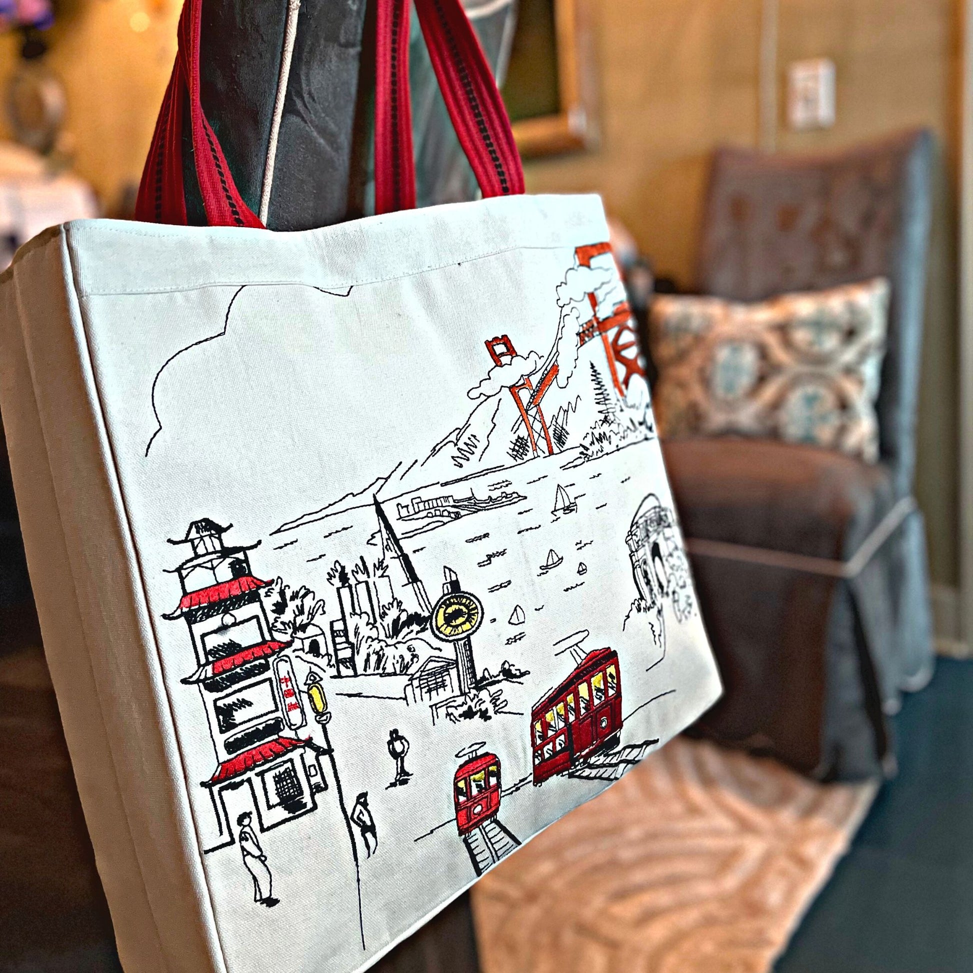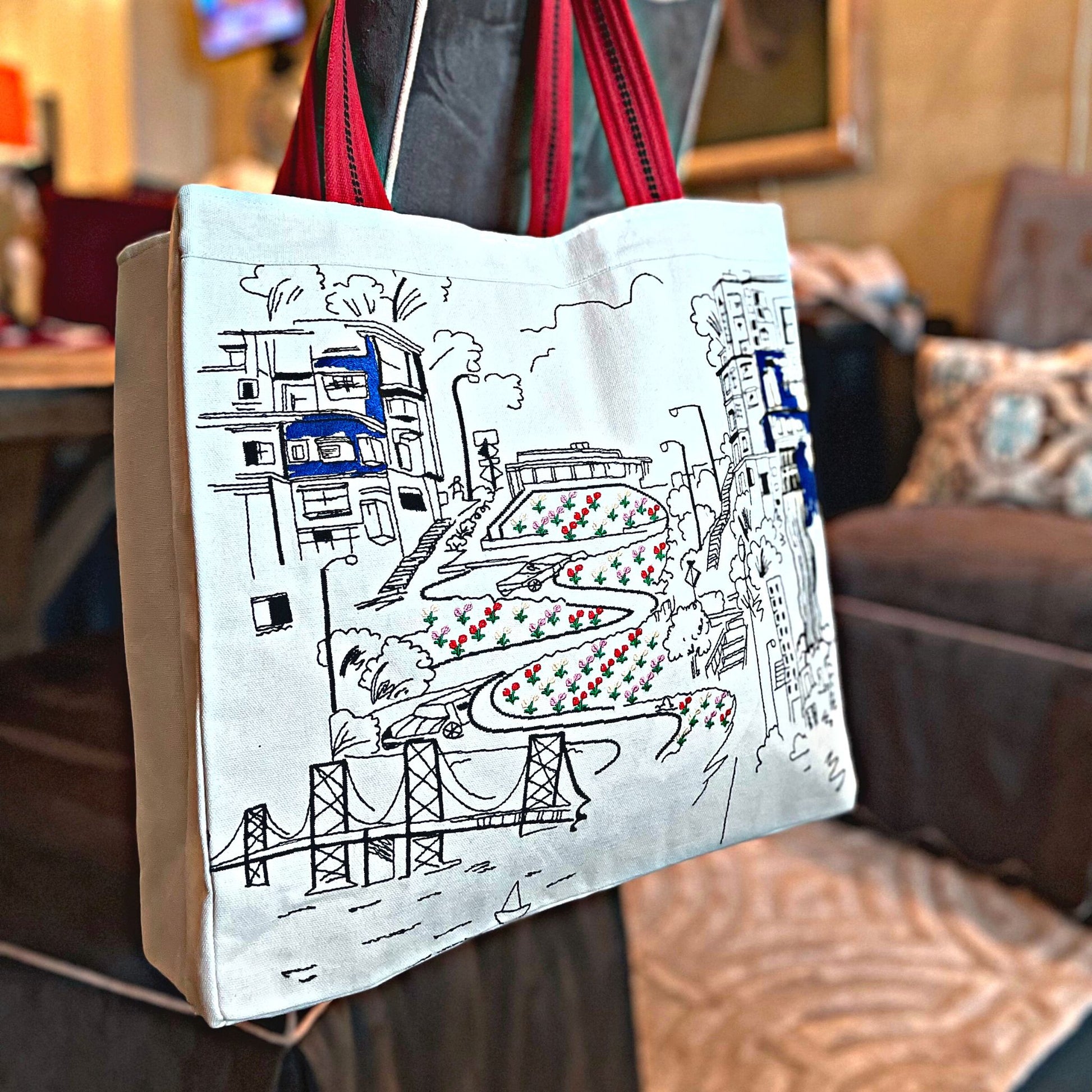 Our 100% cotton canvas totes are beautifully embroidered in our signature, modern whimsical design style with hints of brilliant color, bringing each of our skylines to life. Each Tote comes in two color options of Day (Cream) and Night (Black). Our totes come with red waterproof washable lining, an inside pocket and attractive ribbed red straps. The day and night options are showing each side of the same bag.