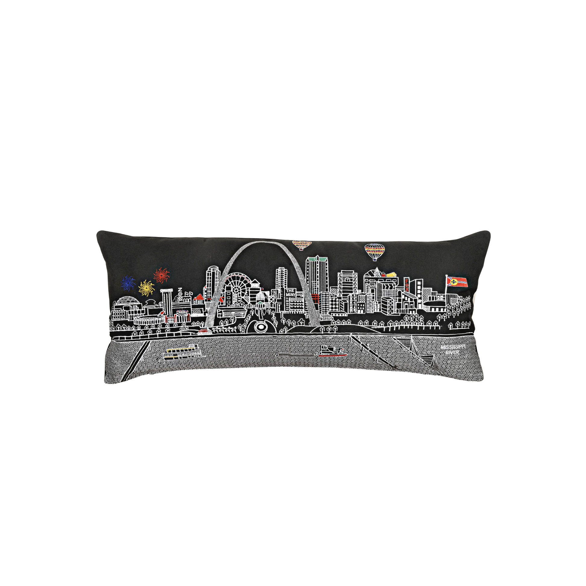 The Gateway to the West, St. Louis is a city known for Art Museum, Busch Stadium, the St. Louis Zoo and the Science Center. A city known for its love of baseball, the Gateway Arch - all embroidered on our modern pillow. The St Louis pillow comes in queen. size. We also offer it in our day and night designs. Pillow has a red zipper at the bottom.